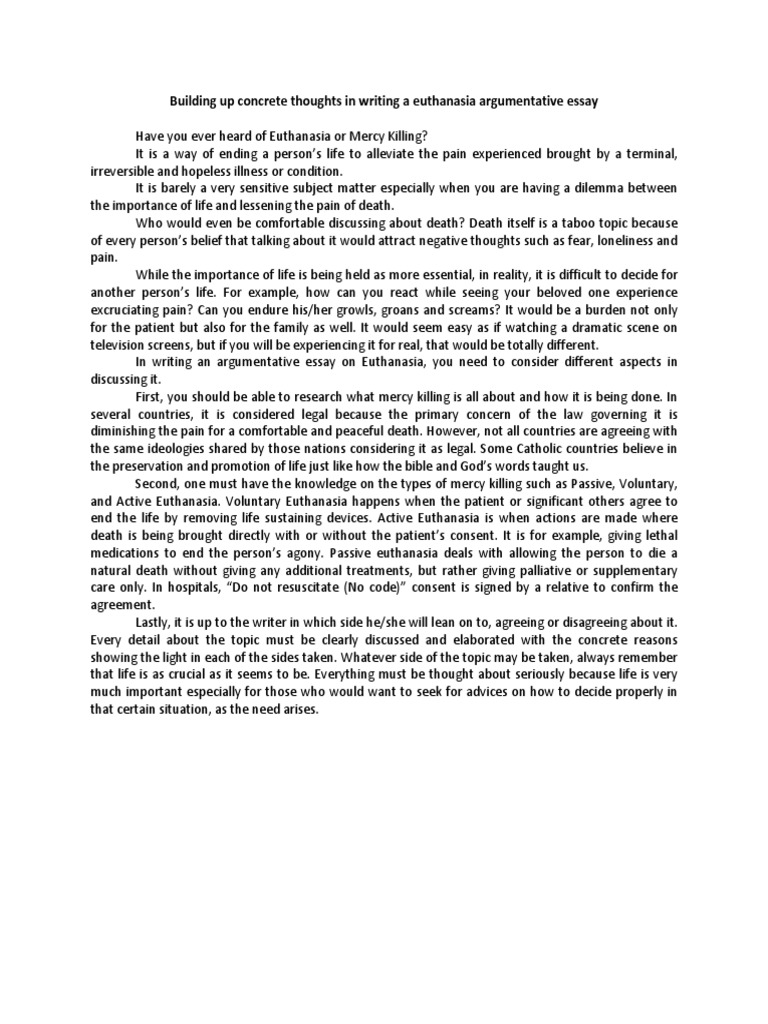 Euthanasia is one of the subjects that have faced intense debate over time, the legalization of euthanasia have been debated for many years with different views presented in terms of ethical and legal consideration for both patients and health care providers. Healthcare providers are faced with ethical dilemmas when caring for terminally ill patients Argumentative Essay On Euthanasia. When you hear the word death or you hear that someone has died today in the news or on the television I know a lot of people think “Man, I feel sorry for the family that they have to go through that.” or they thank god that it was not them or their family members.”. Sadly though people try to push away death and push away the fact that everyone May 27, · Euthanasia Argumentative Essay Example Introduction. One of the greatest debates surrounding the topic of euthanasia revolves around its legalization. The legality of euthanasia has spurred a lot of debate due to the rise in